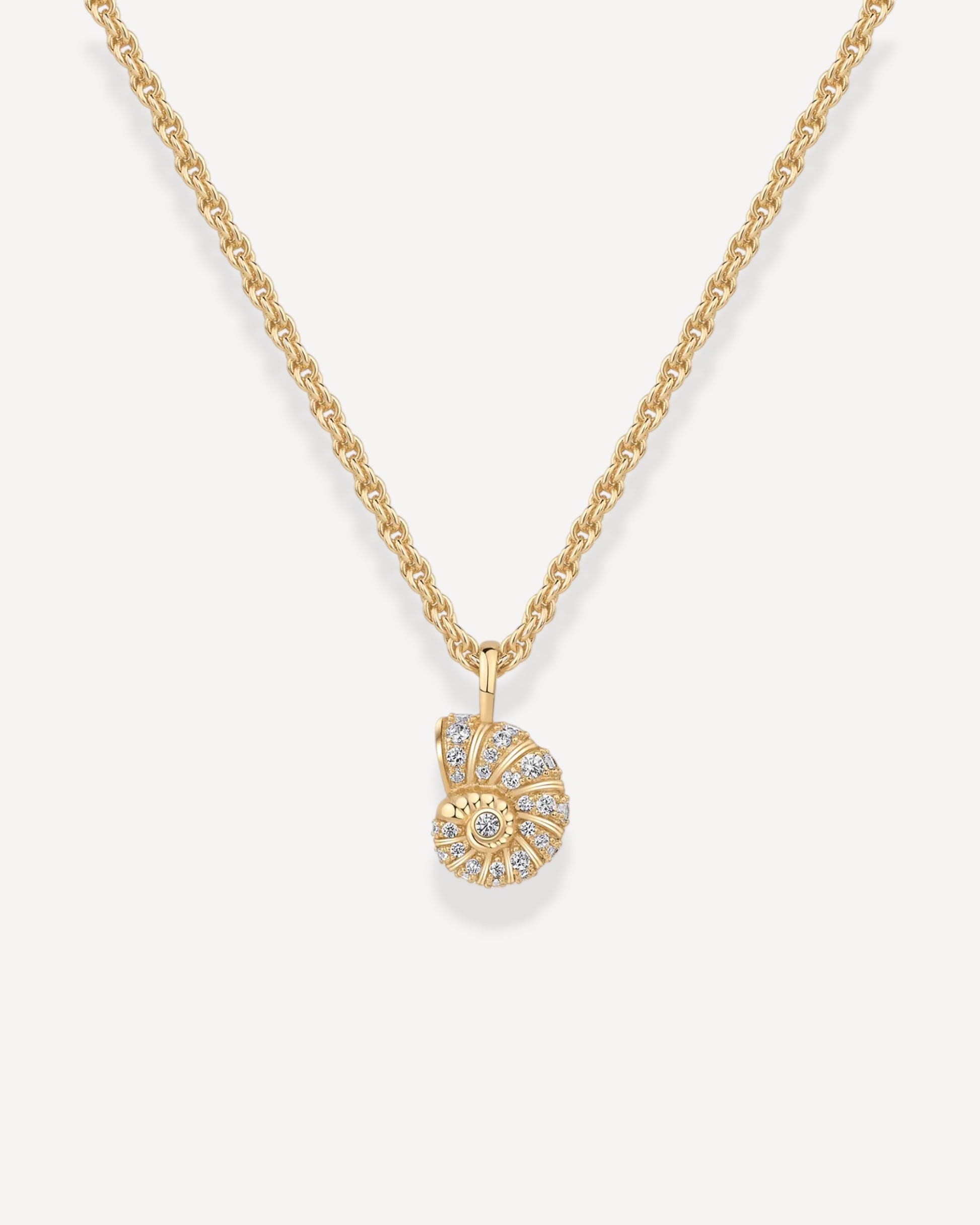 Aurora Conch Pendant is inspired by the calm, effortless beauty of the ocean. The conch silhouette is shaped in 14k gold plating and brought to life with a soft shimmer of cubic zirconia, giving the piece a delicate radiance that catches the light with every movement. Paired with a refined rope chain, it sits gracefully on the skin and adds a touch of warmth and elegance to any look. Its design feels timeless and quietly expressive, the kind of pendant you reach for when you want something meaningful, feminine, and naturally polished.